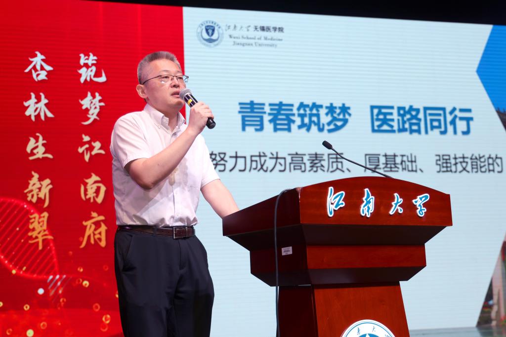 笪学荣致辞欢迎全体医学新生们的到来,他首先向同学们介绍了无锡的经济建设、历史文化、人文底蕴等方面情况,并详细讲述了无锡卫生健康事业的发展情况,他强调在市校共建机制保障下医学教育与医学人才培养取得新发展,已实现无锡本地医学本-硕-博一体化人才培养通道,他寄语成人影视片