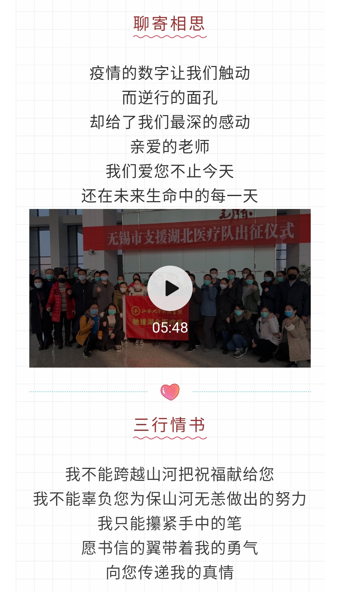 医学生通过录制视频、书写三行情诗等方式表达真情。“老师,您一定要保护好自己”“老师,我们等您平安归来!”……同学们在镜头前露出最美的笑容,诉说着对前线老师们的美好祝愿。“穿上纯白的战衣,支撑起彩色的世界”“待春如期至,等花灿然开,盼君健康归”等三两句告白,一笔一划中充满着同学们对老师的祝福和敬意。老师们在一线收到学生祝福十分感动和感谢,表示一定完成任务平安归来,同时也勉励医学生努力学好自己的专业,将来能更好的为祖国服务,让成人影视片