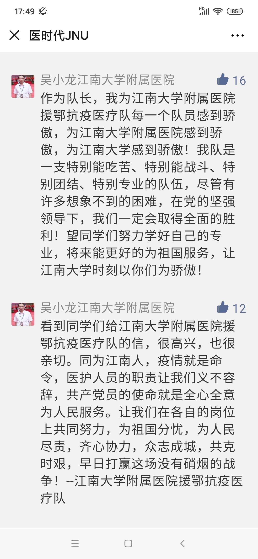 的带教老师、临床导师以及班主任。医学院学子得知消息后十分振奋,纷纷用自己的方式为驰鄂前线的老师们加油,表达对他们的无限敬意。