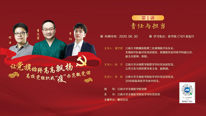 附属医院第二批援鄂医疗队队长董文霞教授,董教授首先讲述了自己和队员在援鄂抗疫时整建制接管一个重症病区,期间对患者生命健康用心守护,对医疗队员的防护安全严谨监督的感人事迹,体现了新时代背景下医者的责任与担当;第二位讲授者是医学院医学学科党支部党员、公共卫生与预防医学系主任程洋副教授,他讲述了自己在无锡市卫生健康委员会挂职期间,全面参与协调无锡市医疗单位的抗疫防疫工作,让我们了解一名政府公务人员的责任与担当;第三位讲授者是医学学科支部学生党员李阳,他分享了作为一名3000多人社区的志愿者,挨家挨户整理上报数据,积极参与到疫情防控一线工作中经历与体会,让我们了解一名学生党员社区志愿者的责任与担当。在一个多小时的微党课中,三位讲授者用亲身的经历、深刻的感悟、生动的语言,展现了特殊时代背景下高校师生党员以行动践行党员使命,以担当奋勇战“疫”的光辉事迹。