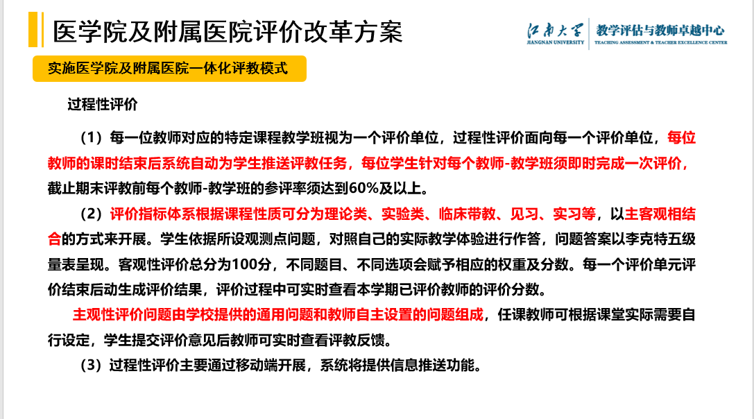 会上,李博聚焦分类评价、互动发展、多元开放的评价理念,针对医学院授课模式、学生评教压力、实训见习课程分类评价、教务基础信息维护等一体化教学评价问题,介绍了“分类评价+分档赋分+医学院附院一体化”评价改革模式。商鼎软件公司吕商华从教学评价一体化系统的产品设计、技术参数等角度向与会人员详细介绍了基础数据、排选课、指标库管理、进度监控、数据处理与统计分析等功能模块定位于设计理念。刘和强调教学评价一体化系统的研发将为常态化医学教学质量动态监测提供良好的工具和平台,有利于引导医学院与附属医院教师开展教学改进,也是校地合作共建医学院的积极举措。期间,与会人员就过程性评价反馈与共享、评价结果的呈现与运用、移动终端用户体验等重点关注点进行交流探讨。