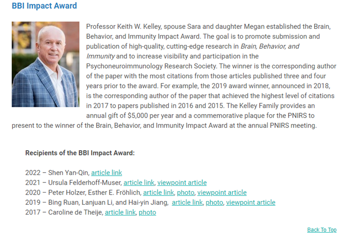 首位,也是中国第二位获得该奖项的作者。国际著名神经免疫学家,BBI前主编,美国伊利诺伊州立大学KEITH KELLEY教授评价该项工作是Cutting-edge work。
