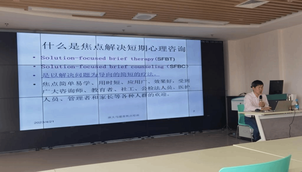 培训中,马教授详细向研究生导师们介绍焦点解决技术在短期心理咨询中的应用,对焦点解决的重要观点进行分析,运用丰富的实际案例向大家强调赋能的重要性。他在与研究生导师互动时强调,在与学生沟通时,要多运用正向引导,与学生建立互信关系,强化解决问题的目标。