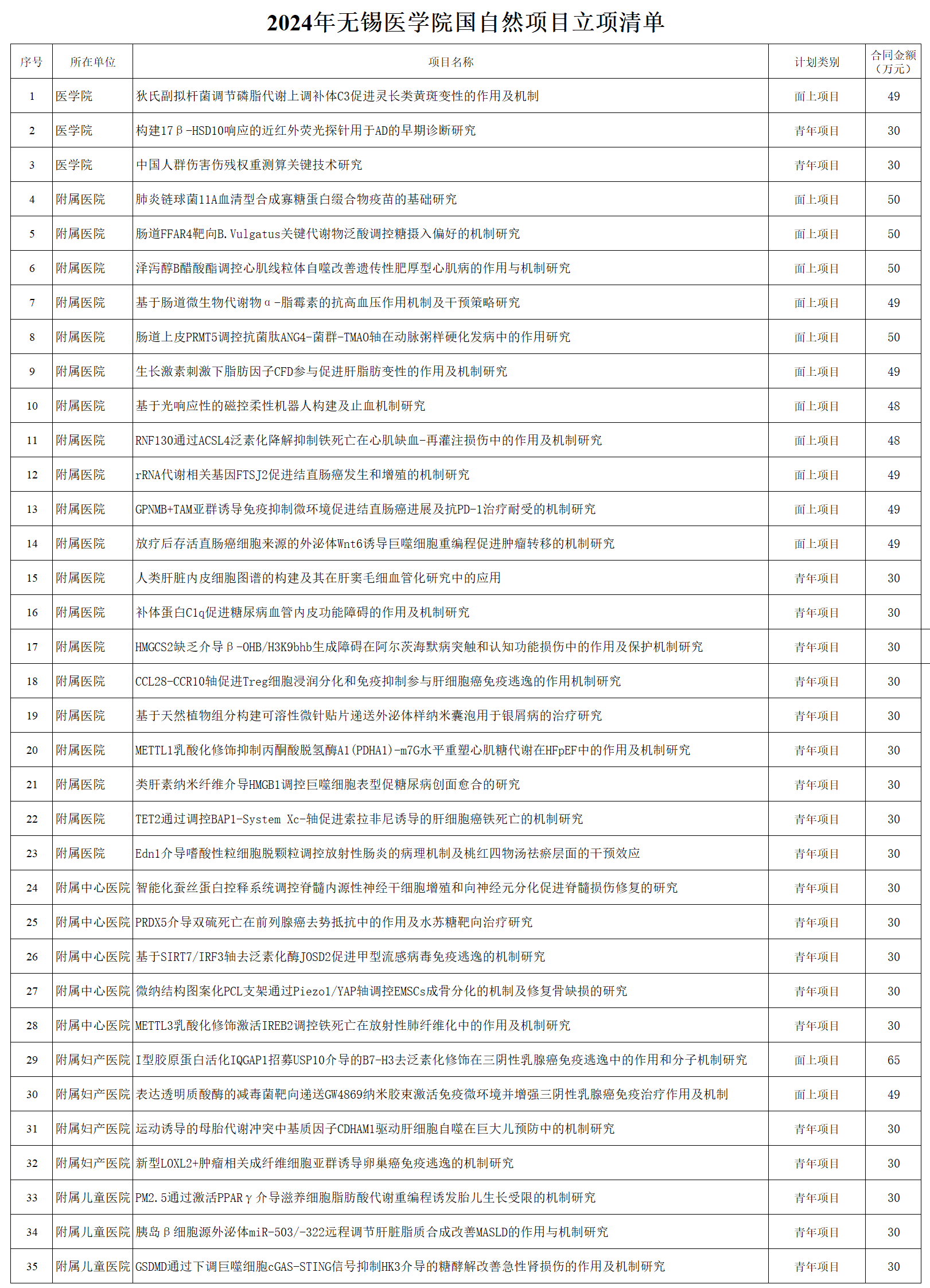协同附属医院在本年度国家自然科学基金项目申报工作中再创佳绩!2024年共有35项项目获立项资助,获批项目数、批准项目经费,再创历史新高,其中,面上项目14项,青年基金项目21项,获得直接经费1334万元,为医学院完成十四五科研项目目标打下坚实基础!