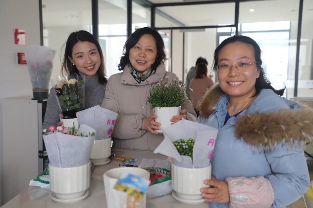 活动首站设于教师发展中心,女教职工们在专业花匠指导下亲手栽种绿植。大家精心挑选多肉、绿萝等盆栽,培土、修枝、装饰,看着亲手种植的一盆盆生机盎然的绿植点缀于办公环境中,大家感受到了盎然绿意和快乐心情!
