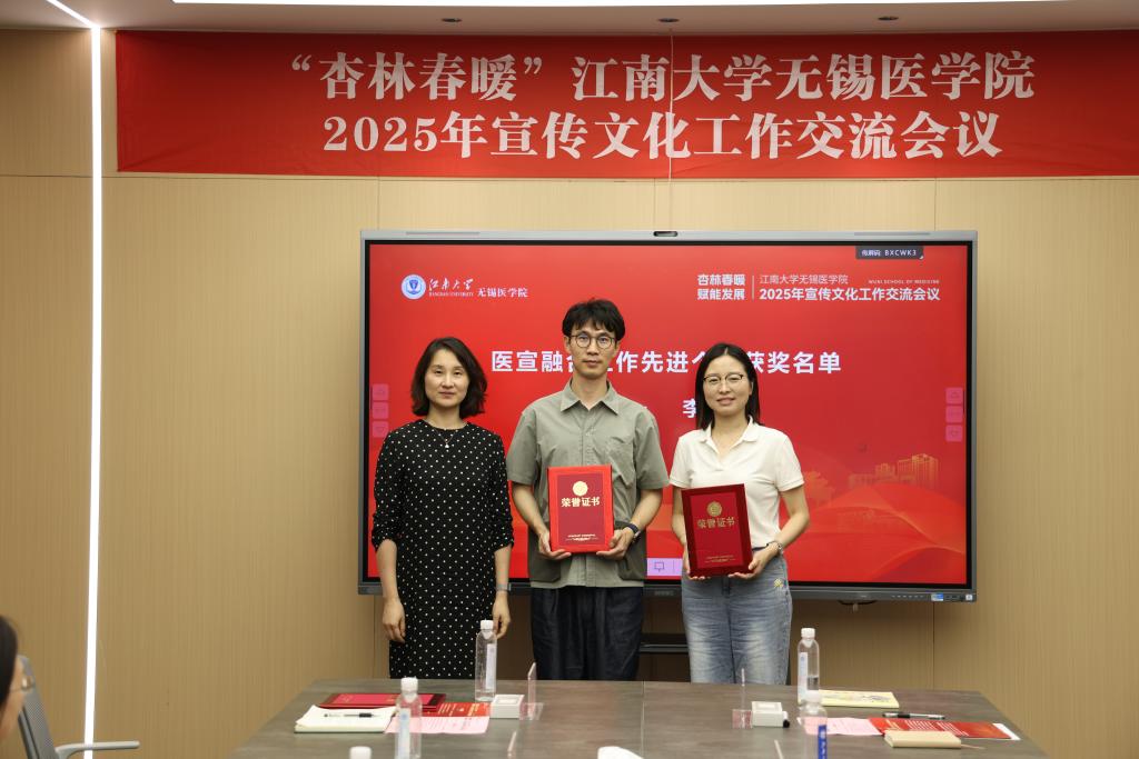 会上,对2024-2025年度学院宣传工作积极分子、医宣融合工作先进个人进行了表彰。附属医院丁一、附属中心医院李霞荣荣获医宣融合工作先进个人,鲁钦正等11名教师及石一等8名学生荣获宣传工作积极分子称号。