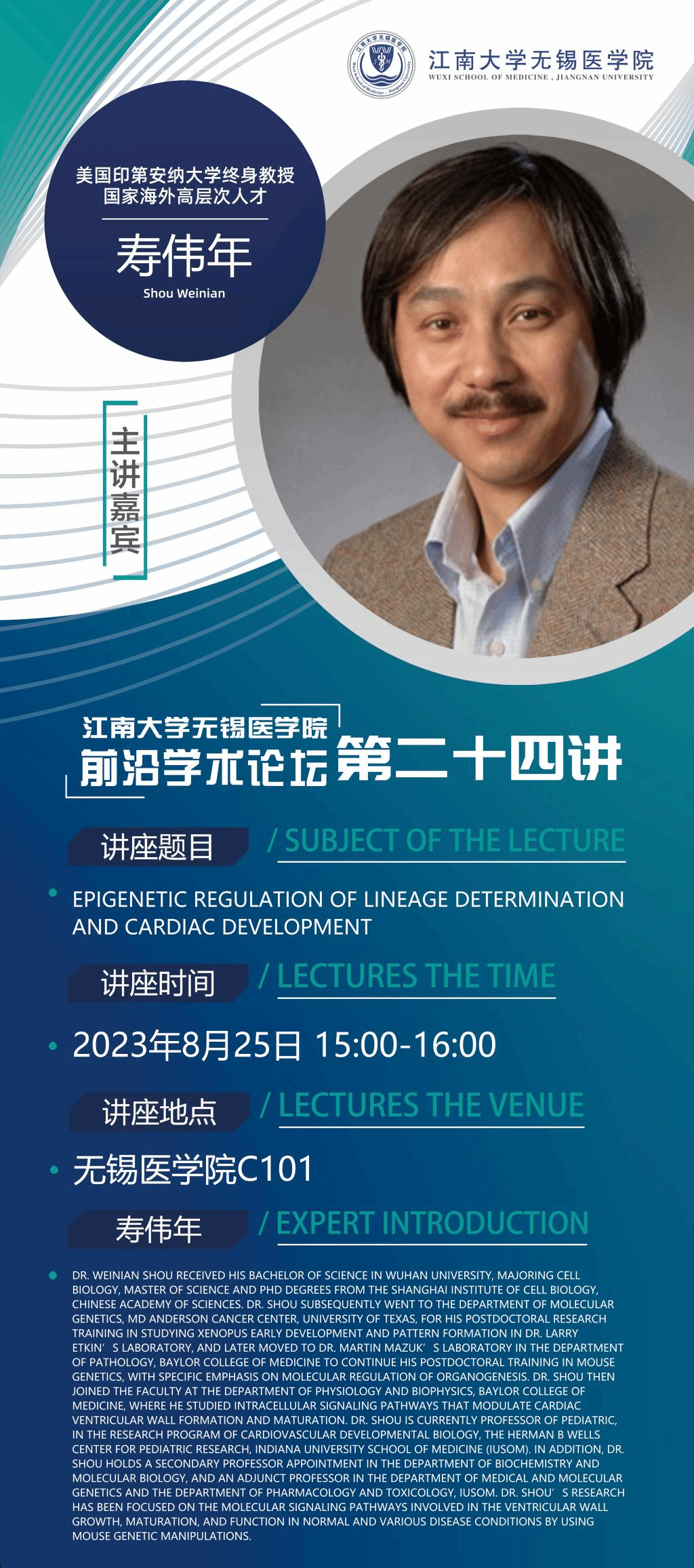 讲座题目:Epigenetic regulation of lineage determination and cardiac development