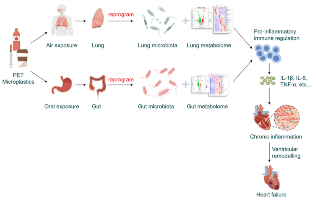 医学院/附属医院心内科王晓彦教授、顾鑫医师团队联合南京医科大学杜颖强等人,在环境科学领域知名期刊《Journal of Hazardous Materials》发表题为"Exposure to polyethylene terephthalate micro(nano)plastics exacerbates inflammation and fibrosis after myocardial infarction by reprogramming the gut and lung microbiota and metabolome"的研究成果。该研究首次揭示环境微塑料污染与心血管疾病进展的分子机制关联,为评估微塑料暴露的临床风险提供了证据。研究团队通过临床样本检测,在急性心肌梗死患者冠状动脉循环中检出微塑料,这一发现提示微塑料暴露可能构成心血管疾病的新型风险因子。针对PET这一广泛应用于食品包装、纺织等民生领域的高分子材料,团队构建心肌梗死(MI)动物模型,创新性地采用多组学整合分析策略,结合心脏功能评估、肠道/肺脏代谢组学及宏基因组测序技术,揭示PET微塑料通过重塑肠道-肺脏微生物生态、干扰宿主代谢网络、激活免疫炎症级联反应,最终加剧心肌梗死后炎症及纤维化的作用机制。该研究填补了PET微塑料心血管毒性机制研究的空白,对制定临床防治策略和公共卫生政策具有重要参考价值。