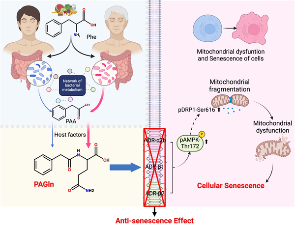 孙宁教授团队联合复旦大学基础医学院在《Nature Aging》发表了题为“Gut microbial-derived phenylacetylglutamine accelerates host cellular senescence“的研究论文。该研究发现肠道菌群来源代谢物苯乙酸(PAA)及次级代谢物苯乙酰谷氨酰胺(PAGln)在宿主血浆中随着年龄的增长而增加;PAGln通过肾上腺素受体-AMPK信号轴影响线粒体动力学紊乱,促进细胞衰老;PAGln诱导的体内外细胞衰老可以通过肾上腺素能受体阻断和体内衰老细胞裂解法治疗来改善。该研究系统地揭示了衰老相关的肠道微生物变化加速细胞衰老的机制之一。该研究深入地解析了微生物和宿主共代谢物PAGln随着年龄的增长而增加的原因,并通过何种机制影响宿主细胞。该研究还进一步验证了阻断肾上腺素能受体以及衰老细胞裂解疗法在延缓PAGln诱导的宿主细胞衰老上的可行性,为对抗衰老提供了新的思路和解决策略。