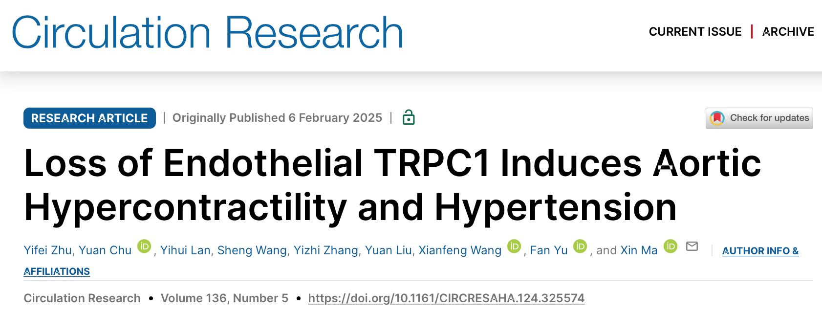 马鑫团队在Circulation Research(IF=16.5)在线发表题为“Loss of Endothelial TRPC1 Induces Aortic Hypercontractility and Hypertension”的研究论文,该研究表明内皮细胞TRPC1缺失诱导主动脉收缩过度和高血压。