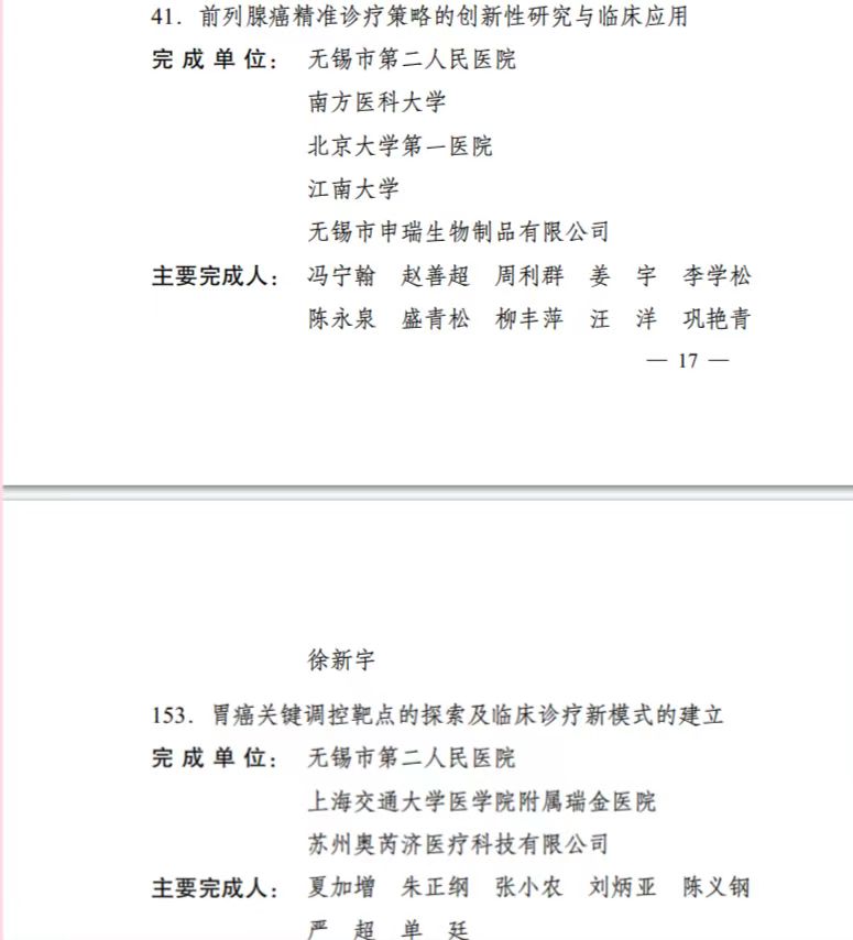附属中心医院)冯宁翰教授领衔的泌尿外科团队项目“前列腺癌精准诊疗策略的创新性研究与临床应用”和夏加增教授领衔的普外科团队项目“胃癌关键调控靶点的探索及临床诊疗新模式的建立”分别摘得2022年度江苏省科学技术一等奖和三等奖。这是继2018年神经外科团队获得无锡卫生首个一等奖后,时隔4年再次摘得的第二个江苏省科学技术一等奖,刷新无锡卫生历史最好成绩。