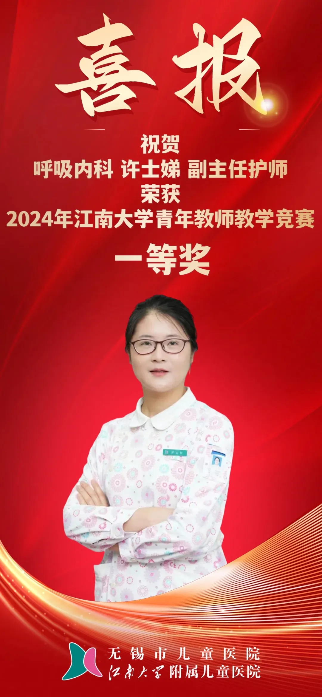 附属儿童医院(无锡市儿童医院)呼吸内科许士娣副主任护师凭借深厚的学科素养和扎实的教学能力荣获教学竞赛一等奖。